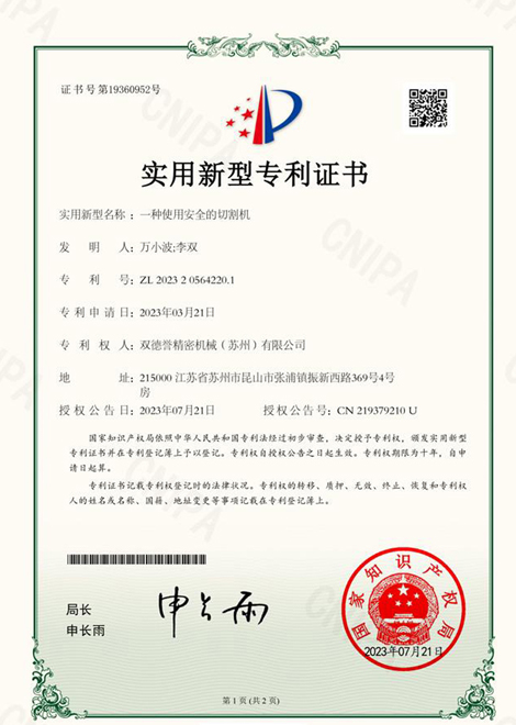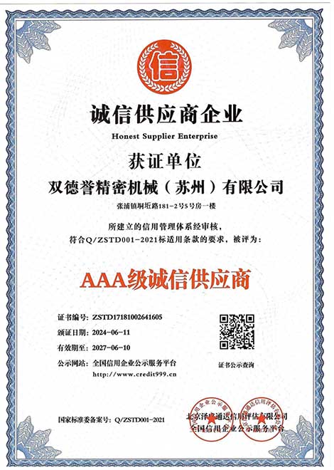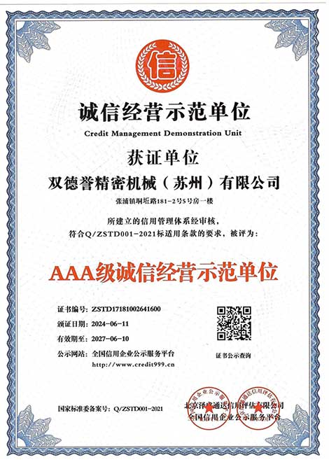 誠信經(jīng)營示范單位-雙德譽(yù)精密機(jī)械(蘇州)有限公司