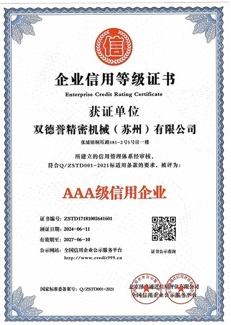 企業(yè)信用等級證書-雙德譽(yù)精密機(jī)械(蘇州)有限公司